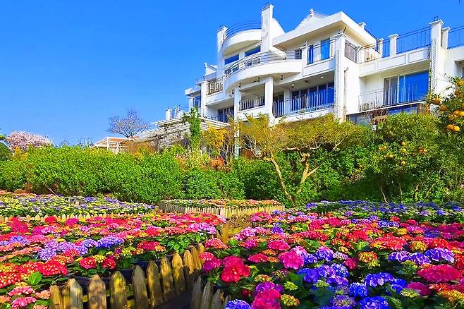 제주 서귀포시 안덕면 덕수리에 자리한 마노르블랑은 유럽풍 건축 양식과 세련된 인테리어로 많은 관광객의 발길을 사로잡고 있으며, 현재는 루피너스가 만개한 봄 정원 덕분에 더욱 화사한 매력을 뽐내고 있습니다.