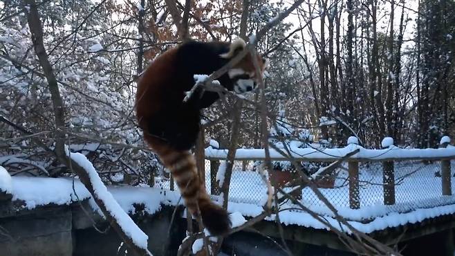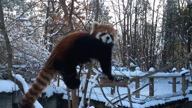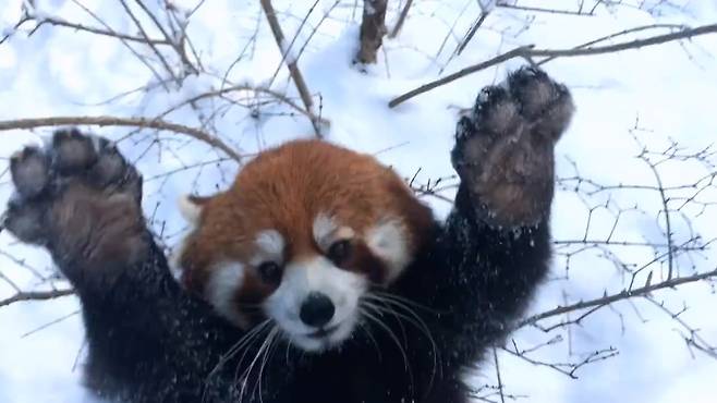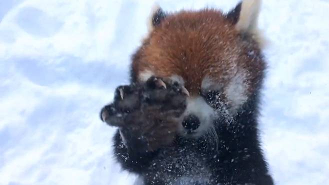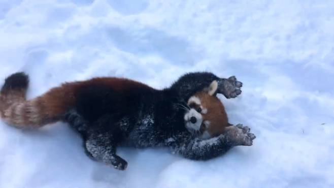 눈이 와서 신이 났는지 인형처럼 예쁘고 귀여운 레서판다가 눈 위에 마구 뒹굴면서 폴짝 폴짝 뛰고 있습니다.