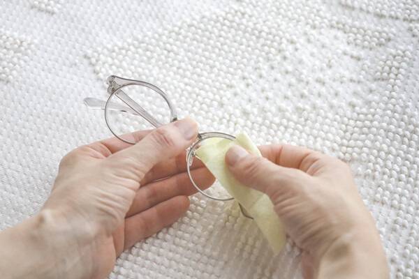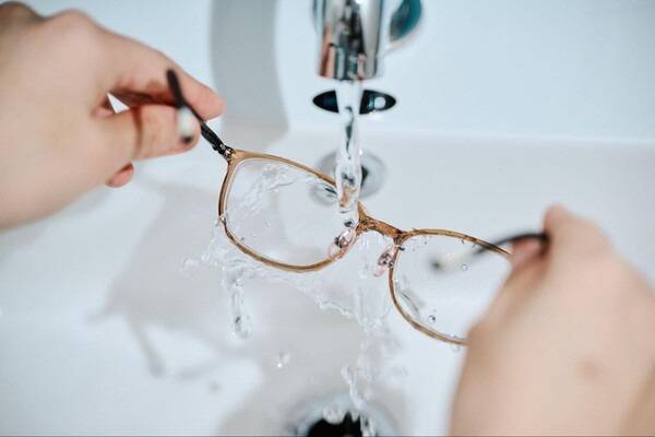 안경을 닦기 전, 반드시 미지근한 물에 렌즈를 헹궈줘야 합니다. 이렇게 하면 표면에 붙은 먼지 입자가 사라져 기스 위험이 줄어듭니다.