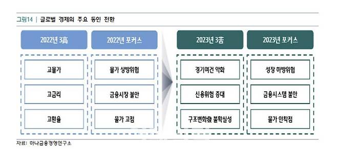 이러한 3고(苦) 측면에서 올해는 ‘물가 상방위험’→‘성장 하방위험’, ‘금융시장 불안’→‘금융시스템 불안’, ‘물가 고점(단기)’→‘물가 안착점(중장기)’으로 관심사가 전환될 것으로 예상했다.