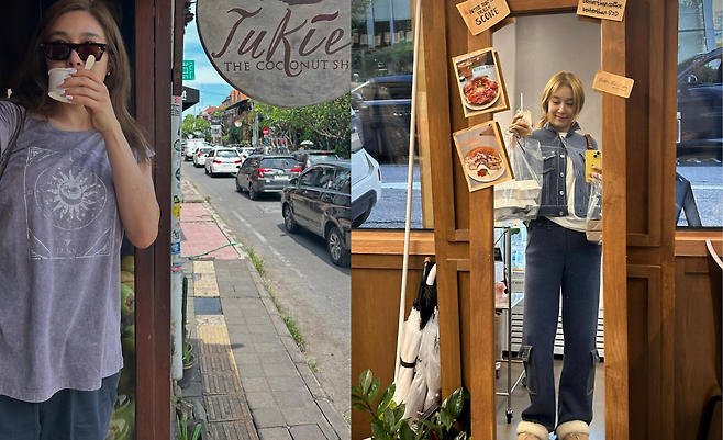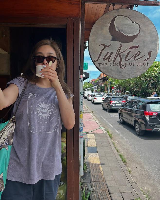 빈티지 무드의 프린트 티셔츠와 선글라스, 에코백을 매치해 휴양지에서의 자유로운 캐주얼룩을 완성하고 있다. 컵을 들고 있는 자연스러운 포즈와 편안한 차림이 여유로운 여행 분위기를 자아낸다
