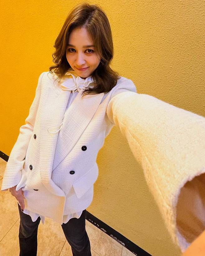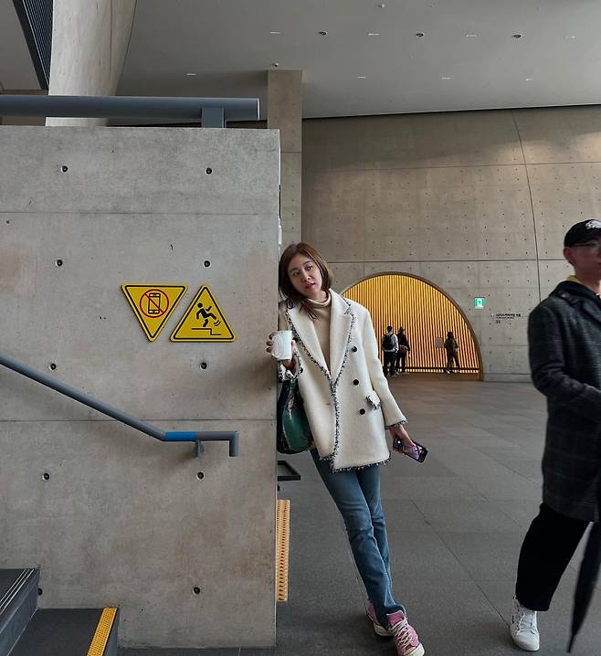 옥주현은 화이트 트위드 코트와 청바지, 핑크 스니커즈를 매치해 도회적이면서도 편안한 시티룩을 연출한다. 심플한 이너와 자연스러운 헤어스타일, 그리고 미니멀한 액세서리가 전체적으로 차분한 분위기를 더한다