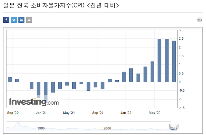 최근 일본의 소비자 물가지수는 이례적으로 3달 연속 2%대를 돌파했어요. 인플레이션 2%대는 2014년 소비세 인상 때를 제외하면 2008년 이후 처음이고요. 당시에도 경기 침체로 인한 엔달러 환율 급등에 따른 일시적 영향이었으니까, 이정도의 물가 상승은 일본의 마지막 부흥기였던 1991년 이후 처음이라 봐야 할 듯해요.
