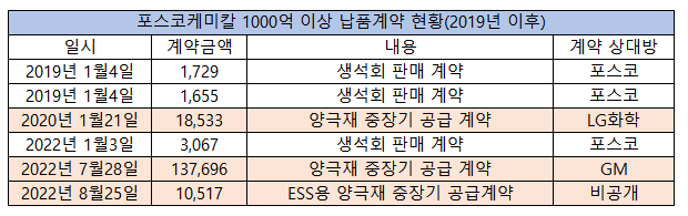 나머지 3차례는 2019년 1월 있었던 1729억원, 1655억원 규모의 생석회 판매 계약 공시와 올해 1월 3067억원 규모의 생석회 판매 계약 공시입니다. 2019년 1월 공시는 포스코케미칼 합병 이전에 있었던 공시이니 사실상 제외해도 무방할 것 같습니다.