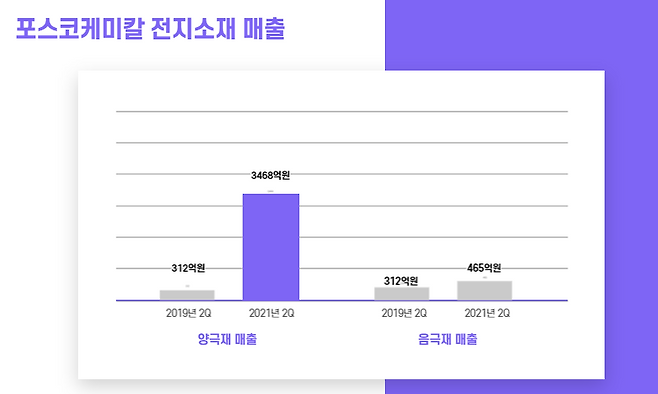 제철소 또는 플랜트, 굴뚝의 축로에 쓸 내화물을 만들던 회사였는데, 이종산업인 배터리 소재를 만드는 회사로 바뀌게 된 거죠. 합병 초기에도 포스코케미칼의 매출 중 내화물이 차지하는 비중은 여전히 높았습니다. 2019년 2분기 전체 매출에서 양극재(312억원)와 음극재(312억원) 등 전지소재가 차지하는 비중은 17%에 그쳤습니다. 올해 2분기 양극재와 음극재 매출은 각각 3468억원, 465억원을 기록했습니다. 전체 매출(8032억원)에서 양극재 및 음극재가 차지하는 비중은 48.9%에 달했습니다.