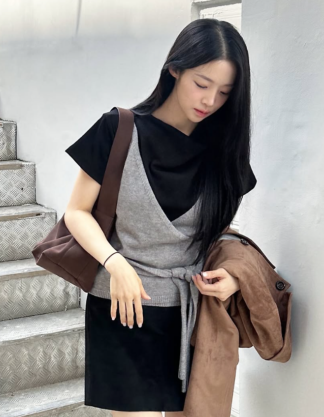 이번 룩의 포인트는 단연 니트 레이어드였어요. 블랙 반팔티 위에 그레이 민소매 니트를 겹쳐 입어, 날씨 변화가 잦은 초가을에 딱 어울리는 코디였죠. 기본적인 컬러 조합이지만, 그레이 특유의 부드러운 톤이 블랙 티셔츠의 강렬함을 중화시켜 세련된 밸런스를 만들어줬어요.