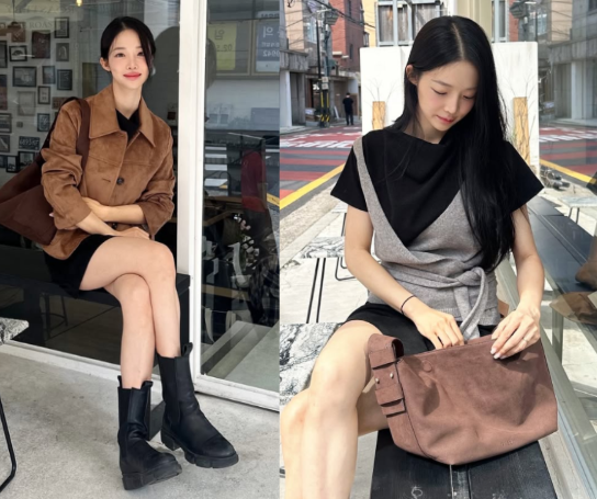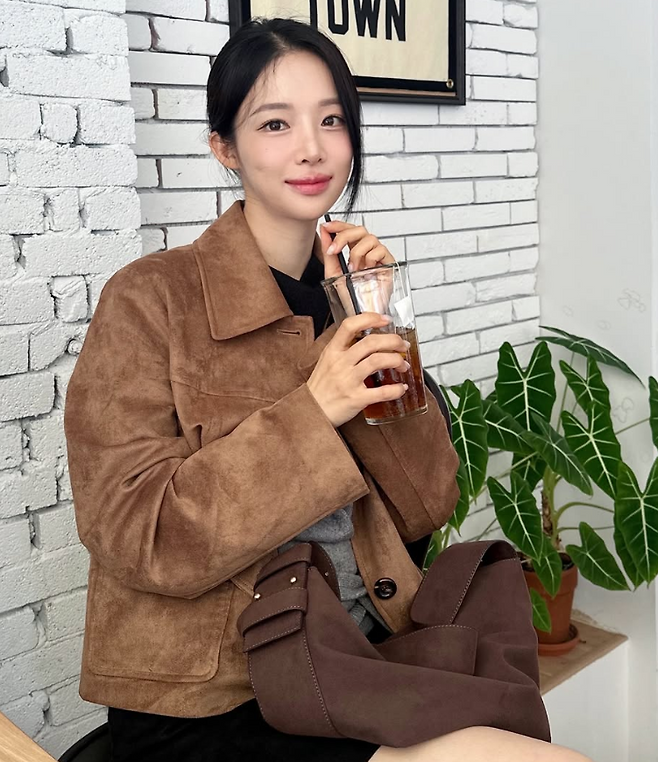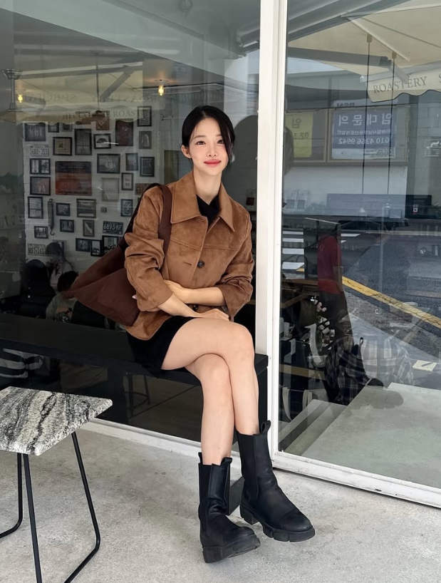 가방은 브라운 스웨이드 숄더백으로 톤온톤 포인트를 더했어요. 여기에 스웨이드 재질의 브라운 자켓은 룩 전체의 톤을 맞춰주며, 따뜻하고 감성적인 느낌을 더했죠. 스웨이드 특유의 질감이 주는 따뜻한 무드가 가을 분위기와 찰떡이었어요.