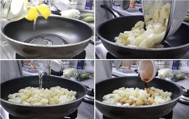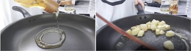 팬에 기름을 두르고 중불에 달군 뒤 감자를 넣어줍니다.
