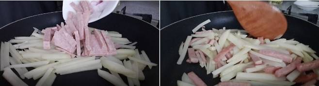 감자가 반투명해지면 채 썰어둔 스팸도 넣어줍니다