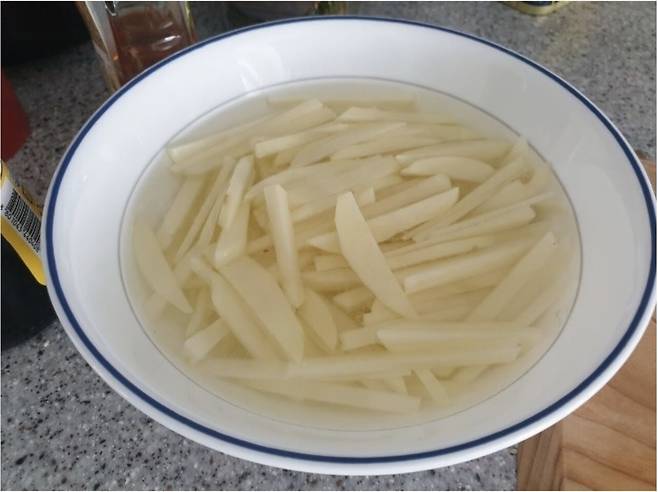 썰어둔 감자는 찬물에 10분 정도 담가서 전분기를 빼주세요