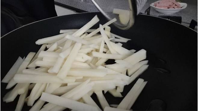 감자가 반투명해지면 채 썰어둔 스팸도 넣어줍니다