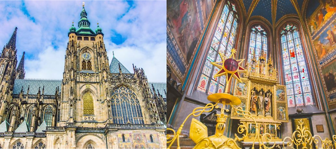 프라하성은 중세 시대 성 중 가장 큰 규모로 알려져 있는데요. 프라하 시내의 어디를 가도 조금만 고개를 돌리면 우뚝 솟아 오른 성을 발견할 수 있다고 합니다. 프라하성의 하이라이트는 '성 비투스 대성당'인데요. 바깥에서 볼때도 웅장했지만 내부는 놀랍도록 성대하다고 합니다. 무려 천년에 걸쳐 완공된 성당은 완벽한 대칭과 찬란하게 빛나는 스테인드 글라스가 특징입니다.