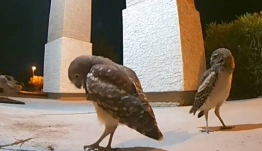 한동안 카메라 앞을 지키던 올빼미들은 곧 주변을 탐색하기 시작했습니다. 녀석들은 현관 앞 바닥을 이리저리 쪼아가며 먹이를 찾기 시작했고, 이내 곤충을 사냥하며 ‘디너 파티’를 열었습니다.