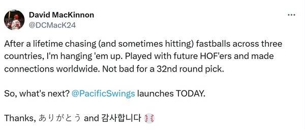 지난 시즌 삼성 라이온즈에서 몸 담았던 데이비드 맥키넌이 은퇴를 선언했다.