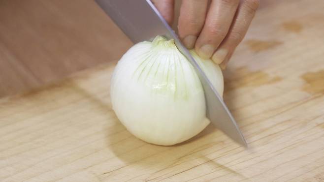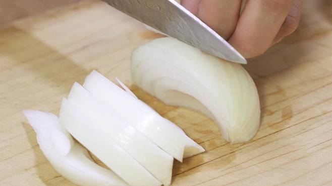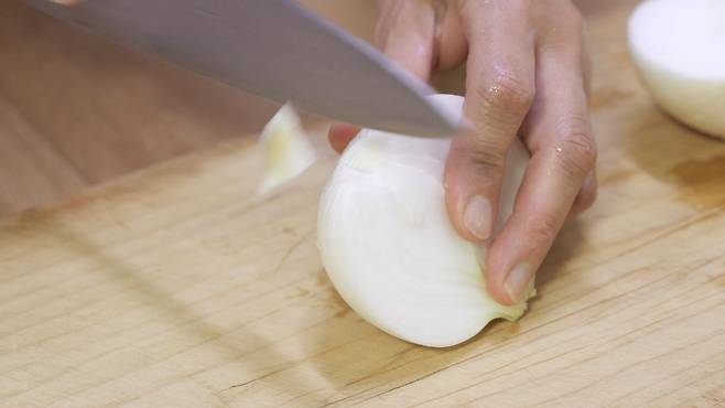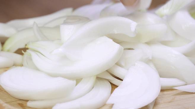 먼저 껍질을 벗긴 양파를 반으로 갈라 주세요. 그리고 심지를 제거한 후 채 썰어 주세요. 심지를 제거하지 않고 채 썰게 되면 나중에 양파를 분리할 때 힘들어요. 그래서 먼저 심지를 제거한 후 썰어 주는 것이 보다 편하답니다.
