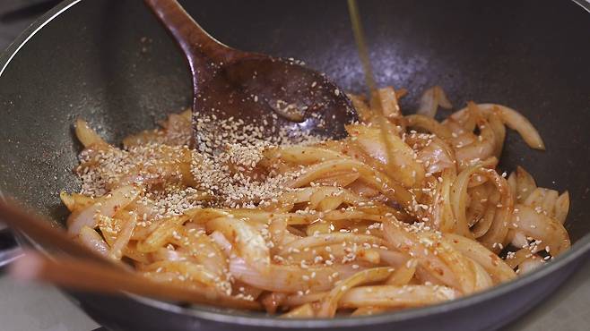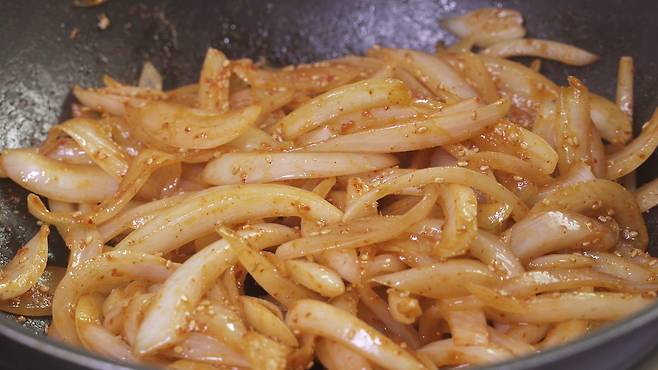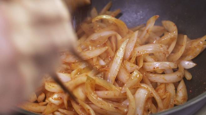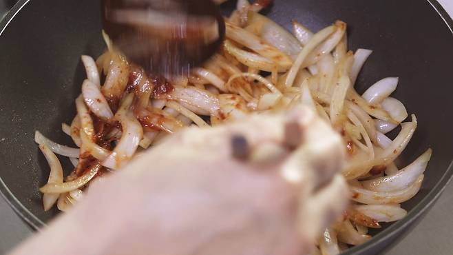 노릇해졌을 때, 고추장을 한 스푼 넣은 뒤 1분간 계속 볶아주세요. 너무 오랫동안 볶게 되면 양파의 아삭함이 사라져 맛이 없어요. 그래서 아삭함을 최대한 살리면서 맛도 좋은 시간이 딱! 1분이에요.