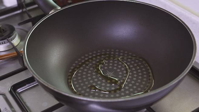웍팬에 식용유를 넉넉히 두른 후 '중불'에서 프라이팬을 데워 주세요. 약간 도톰한 웍에 해야 볶기도 편하고 더욱 맛나게 볶아낼 수 있어요.
