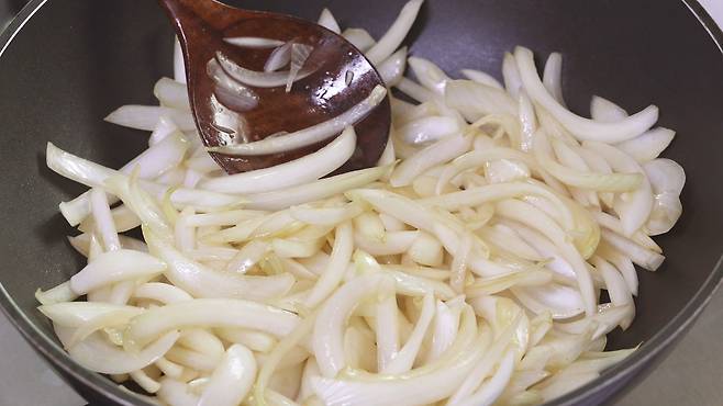 양파가 노릇노릇 황금색으로 변할 때까지 계속해서 저어가며 볶아주세요. 이때 주걱 두 개를 활용해서 양손으로 볶으면 보다 편하게 볶을 수 있어요.