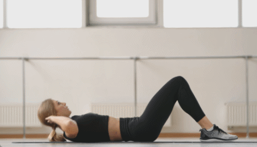 매트에 등을 대고 누워서 무릎을 구부리고 발바닥을 바닥에 단단히 고정합니다. 손은 머리 뒤로 가져가서 위치합니다. 복부에 긴장을 느끼면서 상체를 들어 올린 후, 천천히 시작 자세로 돌아갑니다. 이 동작을 반복하세요.