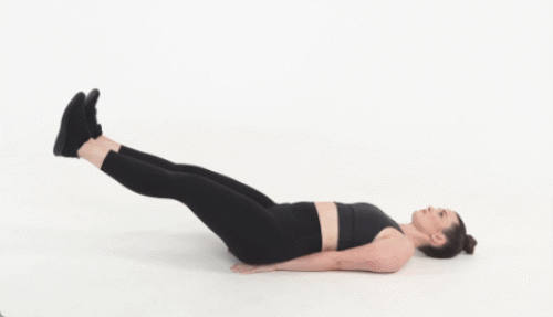매트에 등을 대고 누워서 시작합니다. 다리를 공중으로 들어 올리면서 복부에 힘을 주고, 다리 사이가 벌어지지 않도록 유지합니다. 발끝을 앞으로 뻗어 최대한 무릎을 편 상태로 유지합니다. 이 자세로 최대한 버티세요.