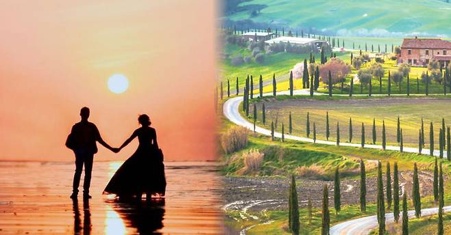 이탈리아 중부 도시인 토스카나에는 옛 유적이 그대로 보존되어있으며 와인이 유명해 고풍스러운 신혼여행을 꿈꾸는 분들에게 추천하는 여행지입니다. 넓게 펼쳐지는 부드러운 구릉지대와 평원은 토스카나를 대표하는 풍경이기도 한데요. 바다가 보이지 않더라도 싱그러운 초록빛으로 가득찬 풍경이 온전한 힐링을 선사해줍니다.