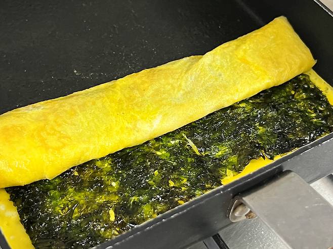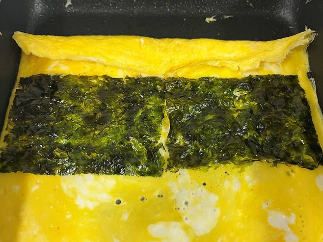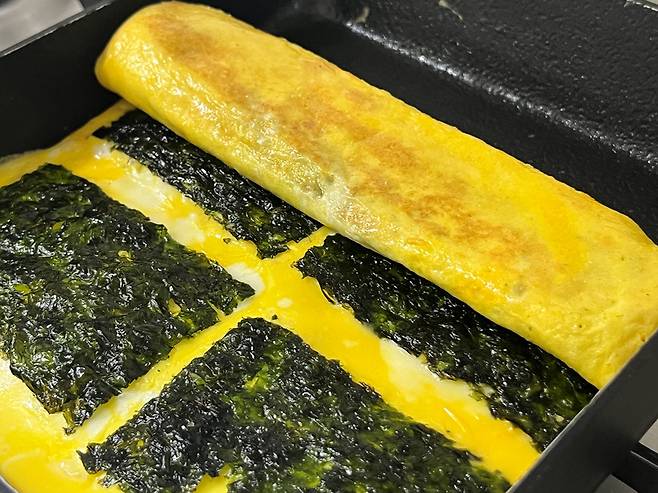 계란이 익기 시작하면 도시락김을 계란 위에 올립니다. 계란말이에 김을 넣으면 김의 감칠맛과 풍미가 더해져 더욱 맛있습니다.