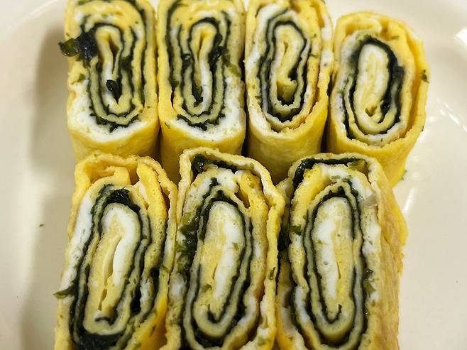 안쪽에 김을 넣어 색다르면서 감칠맛이 도는 김 계란말이가 완성되었습니다. 짭짤한 김이 들어가 간도 적당하게 되어 밥반찬으로 정말 좋습니다.