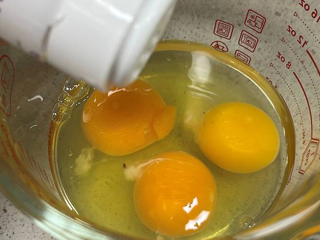 계란 3개를 깨뜨린 다음 맛소금을 3꼬집가량 넣어 간을 맞추세요. 계란을 곱게 풀어 계란물을 준비합니다.