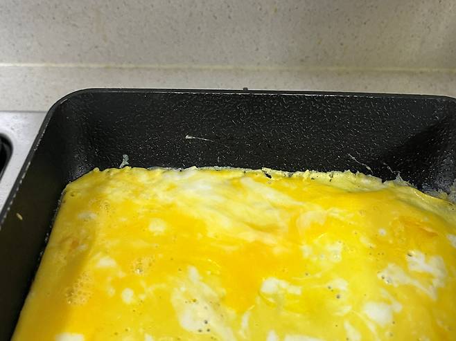 사각팬에 계란물 1/2 정도를 넓고 고르게 붓습니다. 그리고 계란이 살짝 익을 때까지 기다리세요. 계란말이는 약불로 조리합니다.