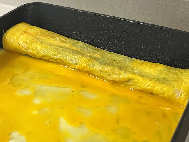 처음 부은 계란을 다 말았으면 끝 쪽으로 가져간 다음 나머지 계란물을 부어 같은 과정을 반복합니다.