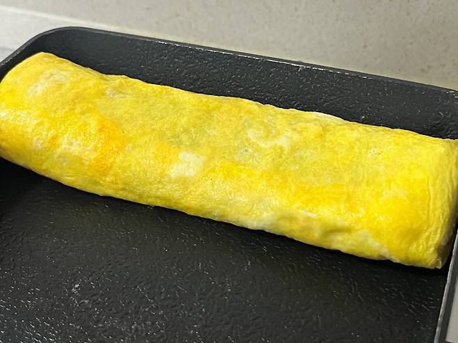 계란이 약간 익으면 김을 깔고 다시 돌돌 말아 줍니다. 계란말이 할 때는 일반 둥근 팬보다 사각팬을 쓰면 훨씬 만들기 쉽고 모양도 예쁘게 됩니다.