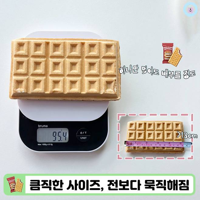 사이즈를 측정해보니 앞선 생우유나 초콜릿 모나카와 비교해 크기는 그대로인데 중량이 10g 정도 더 늘어났더라구요. 기분 탓인지 모르겠지만 실제로 들었을 때엔 팥모나카가 훨씬 더 묵직하게 느껴졌어요.