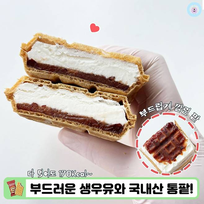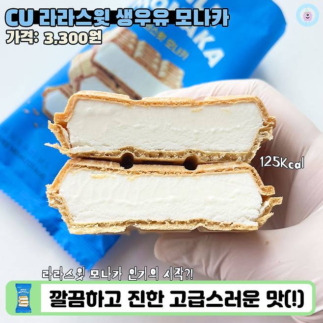 신상 출시 기념으로 기존에 큰 인기를 얻고 있던 생우유 모나카도 살짝 소개해 드리고 넘어갈까 해요! 이름처럼 생우유 아이스크림으로 채워진 제품이고 칼로리는 고작 125Kcal랍니다?!