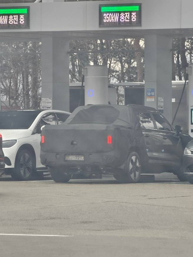 KG모빌리티가 개발 중인 무쏘 EV5가 국내서 충전하는 모습이 최초로 포착됐다. 무쏘 EV5가 국내 최초의 전기 픽업트럭이라는 사실은 일단 명확히 확인된 셈이다.