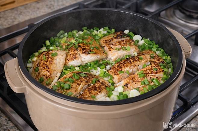 뜸 들이기가 끝나갈 무렵, 미리 구워둔 삼치를 밥 위에 올린다. 뚜껑을 닫고 아주 약한 불에서 5분 정도 더 둔다. 생선의 고소한 향이 밥알 사이사이로 스며드는 과정이다. 마지막으로 송송 썬 쪽파를 듬뿍 올리고, 취향에 따라 들기름 1큰술을 한 바퀴 더 두르면 완성이다.
