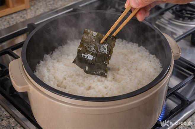 솥밥은 시간 조절이 생명이다. 센 불에서 7~8분 정도 끓여 물기가 잦아들면, 불을 줄여 7~8분 더 익힌다. 그다음 불을 끄고 다시 7~8분 동안 뜸을 들인다. 다시마는 뜸을 들이기 직전에 건져낸다. 이 과정을 지켜야 쌀알이 뭉개지지 않고 고슬고슬해진다.