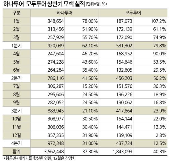 하나투어는 1분기 겨울 성수기를 만끽한 반면, 모두투어는 1분기 정점 이후 하락세를 보였습니다. 특히 4분기 실적에서 큰 차이가 나타났는데요, 하나투어는 분기별 최다 모객수를 기록한 반면 모두투어는 2분기 비수기보다 더 낮은 성적을 나타냈어요.