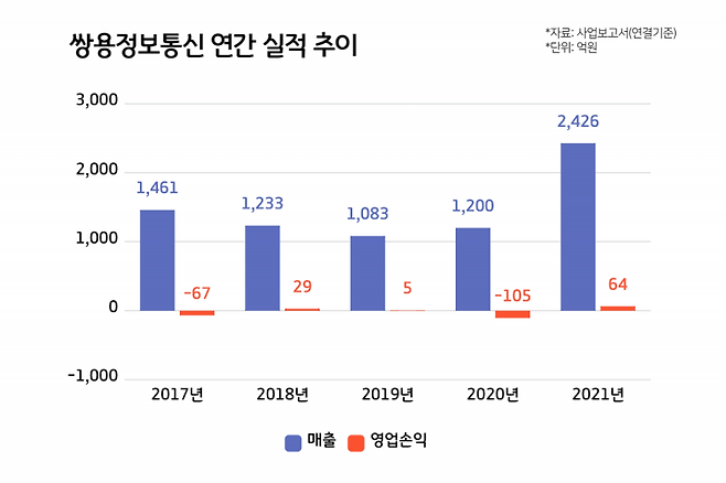 올해는 쌍용정보통신이 클라우드 사업으로 체질개선에 제대로 성공했는지를 가늠할 수 있는 해가 될 것으로 보입니다. 최근 5년간의 실적을 보면 2017년부터 2020년까지는 매출은 연결기준 1000억원대에 머물렀고 영업손실과 이익을 오갔습니다. 하지만 2021년에는 매출은 2426억원으로 훌쩍 뛰었고 64억원의 영업이익도 냈습니다. 이는 아이티센에 인수된 효과로 볼 수 있습니다. 아이티센에서 하던 사업들이 쌍용정보통신과 자회사인 콤텍정보통신으로 넘어오면서 매출과 영업이익이 증가했습니다.