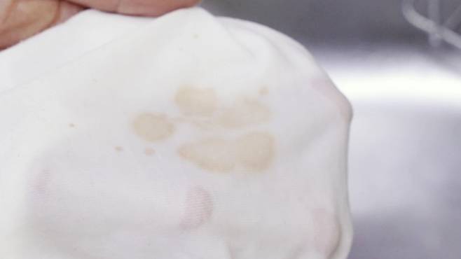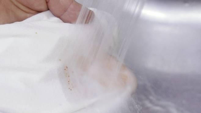이렇게 물로 깨끗이 세탁을 해도 얼룩이 그대로 남아 있는 것이 보이시나요?