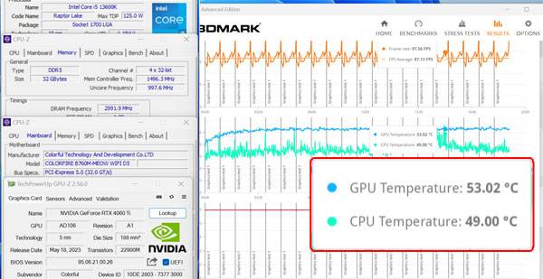 3DMark 타임 스파이 스트레스 테스트 기준 GPU 온도는 약 53℃, CPU(코어 i5-13600K 기준) 온도도 높이 올라가면 그와 비슷한 수준을 기록하는데 그쳐 안정적으로 과열에 대한 걱정없이 안정적으로 사용할 수 있다.