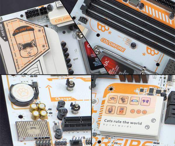 메인보드 전원부 방열판과 오디오 코덱 커버에는 '보비'의 존안이, 메모리 슬롯과 CMOS 베터리에는 육구가 새겨져 있고, 칩셋 방열판에는 주인님이 애용하는 게이밍 기기와 함께 육구를 통한 소유권 행사가 이뤄져 있다. 살짝 보이는 M.2 SSD 고정부에는 나사없이 간단히 고정할 수 있는 클립식 설게가 엿보인다.