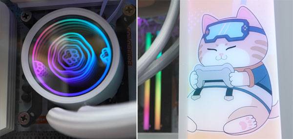 주인님으로 모실 보비는 케이스 전면과 측면 패널에 모습을 보이고, 수랭 쿨러 워터펌프 커버의 인피니티 미러에 '내꺼'라며 육구를 찍어놓으셨다. 강화 유리 패널, 케이스 전면부 쪽에는 게임을 즐기는 '보비'님의 일상을 담은 미오 RGB 라이팅 패널을 세워 수시로 영접하고 안구정화할 수 있다.