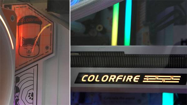 컬러풀 미오 4060 Ti 패키지 STCOM을 구성하는 제품은 '보비'에 어울리게 대체로 분홍색과 오렌지색으로 통일성을 추구했다. 특히 측면 패널을 통해 가장 많은 모습을 드러내는 메인보드의 경우 방열판에는 '보비'의 얼굴과 육구를, 그래픽 카드 사이드 패널의 LED도 육구를 새기셨다.