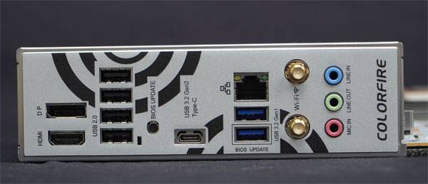 백 패널에는 총 일곱개의 USB 포트*2.0 x4/ 3.0 x2/ 3.1 Type-C x1)와 4K 60Hz 지원 DP/ HMDI 포트, 와이파이 6 및 블루투스 5.2 지원 용 SMA 안테나, 2.5Gbps 이더넷, 5.1 채널 HDM 오디오 및 바이오스 업데이트용 버튼이 제공된다.