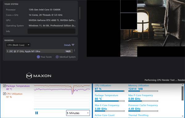 컬러풀 미오 4060 Ti 패키지 STCOM는 베어본 성격의 제품인 만큼 집사의 선택에 따라 CPU와 메모리, SSD 등 성능에 영향을 주는 부품이 바뀌는 만큼 구체적인 성능보다, CPU 쿨러의 성능과 그래픽 카드의 냉각 성능만 간단히 살펴봤다.