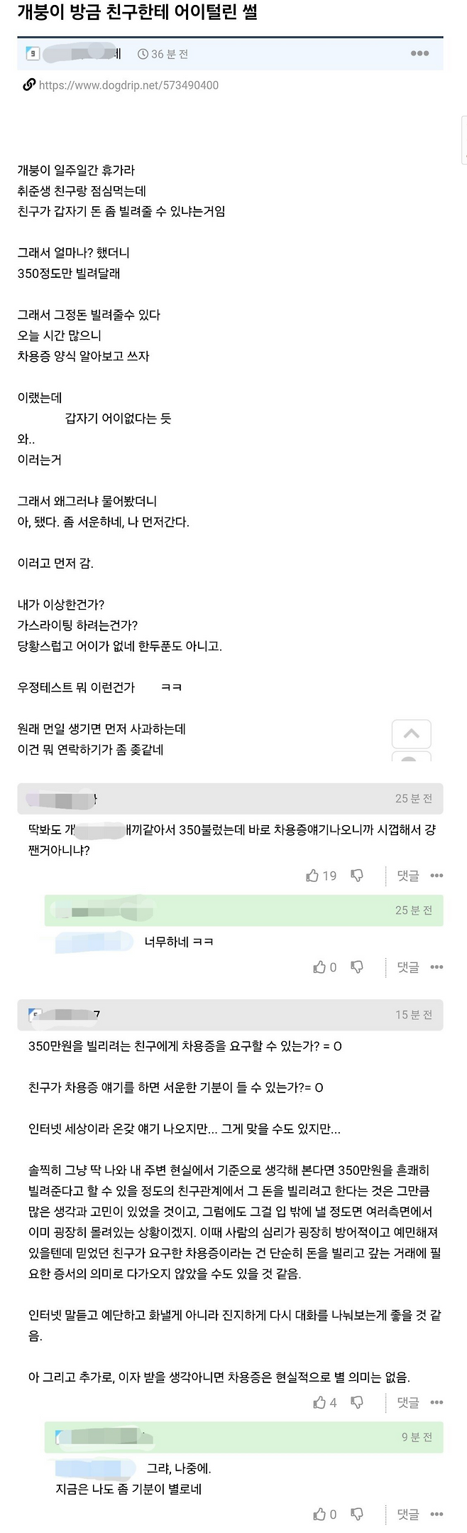 진짜 친구라고 생각해서 어렵게 말한건데 차용증부터 말해서 서운해졌다.