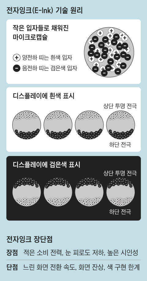 캡슐 안에는 흑색과 흰색 분말이 채워져 있는데 여기에 가해지는 전기가 마이너스(-)일 때에는 흰색 분말이, 플러스(+)일 때에는 백색 분말이 떠오르게 됨