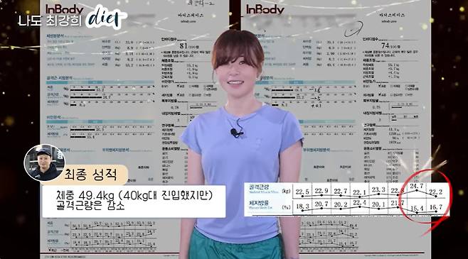 최강희는 최종 49.4kg의 몸무게를 공개했는데, 40kg대에 진입할 수 있었던 비결로 '런닝'을 꼽았다.