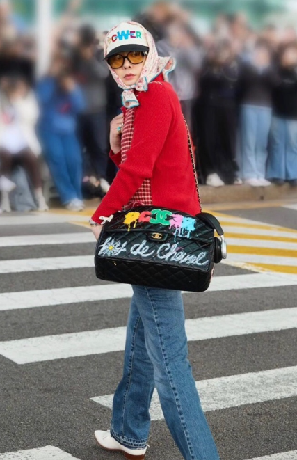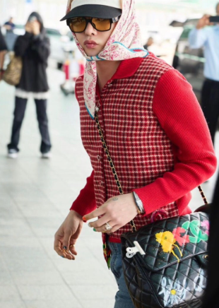 할머니 장롱에 하나쯤은 있을법한 화려한 패턴의 레드 니트에 샤넬 스카프를 머리에 둘러 그래니룩의 진수를 보여준 지디. 왜 지디가 입고 착용하면 힙해보이는 건지 알 수 없는 미스테리다.