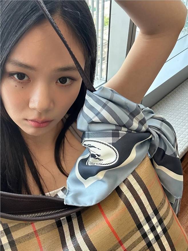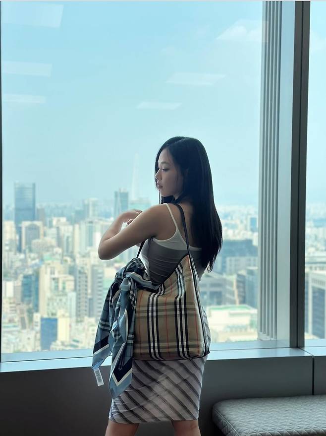 비비는 화이트 슬링백 힐과 회색 슬립 탑, 사선 스트라이프 스커트의 조화는 날카로우면서도 우아한 분위기를 완성했고, 체크 패턴이 돋보이는 버버리 토트백으로 클래식한 감성을 더했습니다.